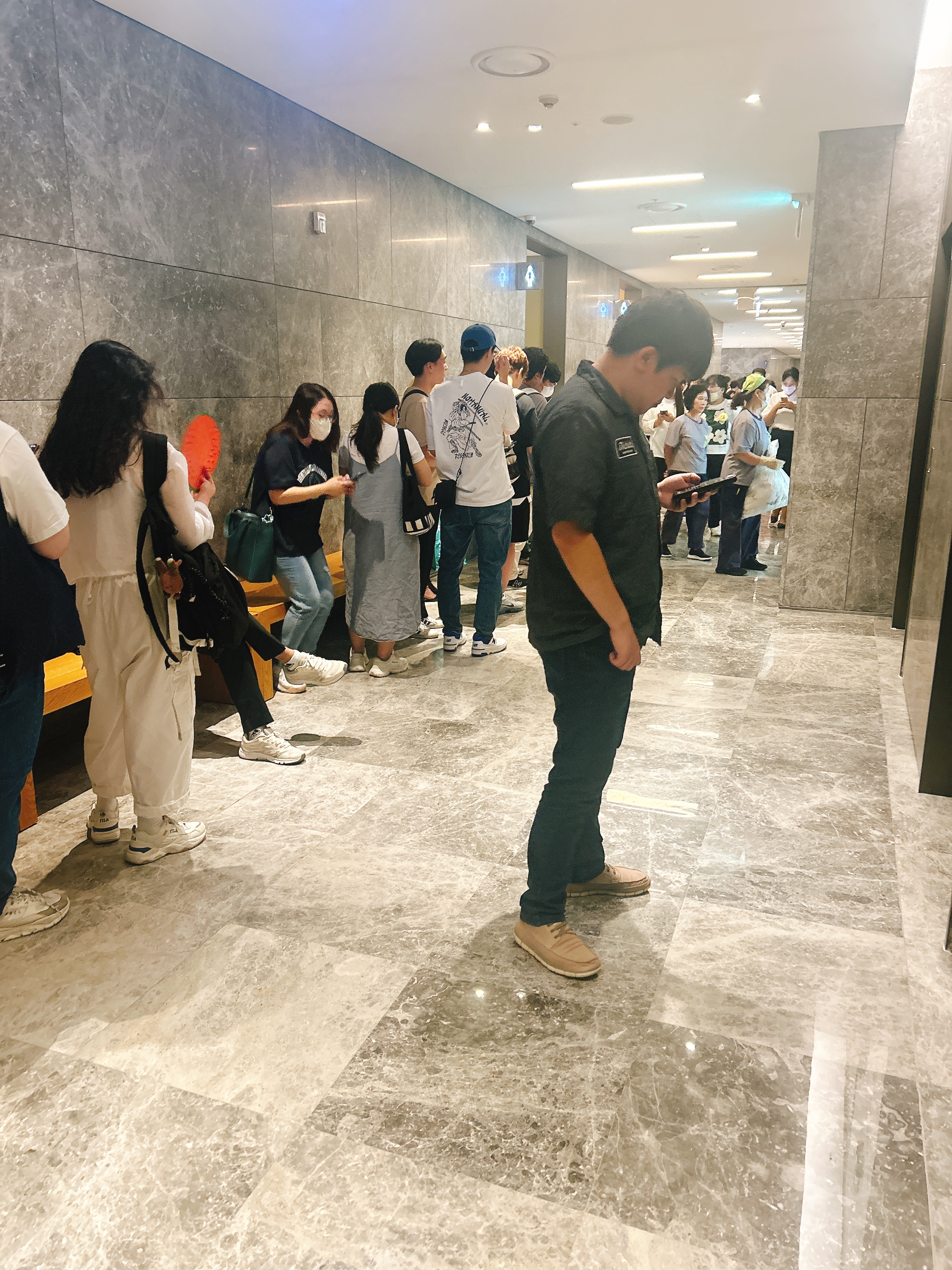10층 엘레베이터에 딱 내린 순간 긴 줄에 깜짝 놀랐습니다.